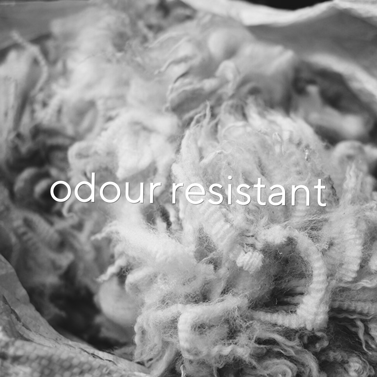 Wool absorbs and locks way odours. The wool fibre actively binds odours within the fibre where bacteria do not thrive.⁶